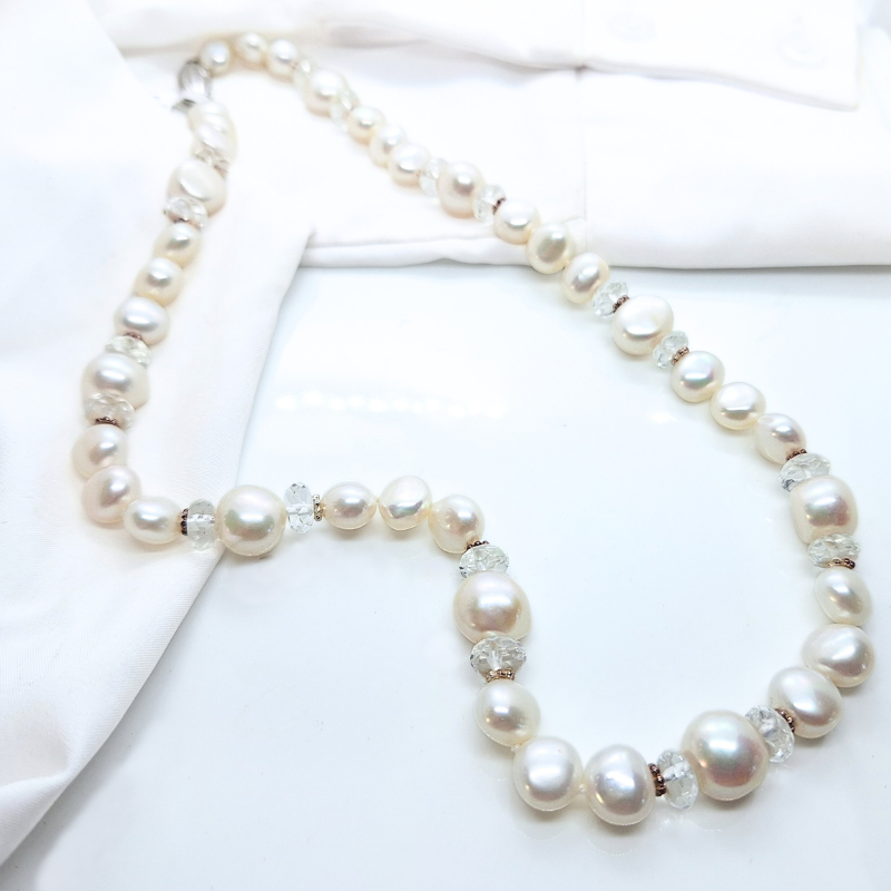 Large, high-gloss freshwater pearls, strung on satin thread and beautifully combined with white crystal. The sensation of authenticity against your skin is the reward after a long day’s work. A silver clasp provides the perfect finishing touch to this elegant strand.